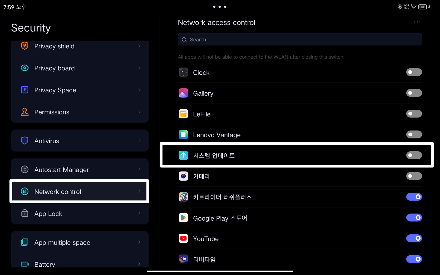 - 앱 목록 중 [시스템 업데이트] 항목 OFF