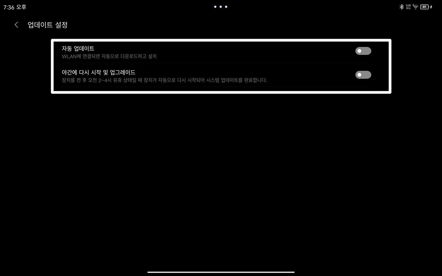 태블릿을 처음 부팅하고 초기 설정을 진행하는 단계에서 업데이트 설정 안내가 나옵니다.
