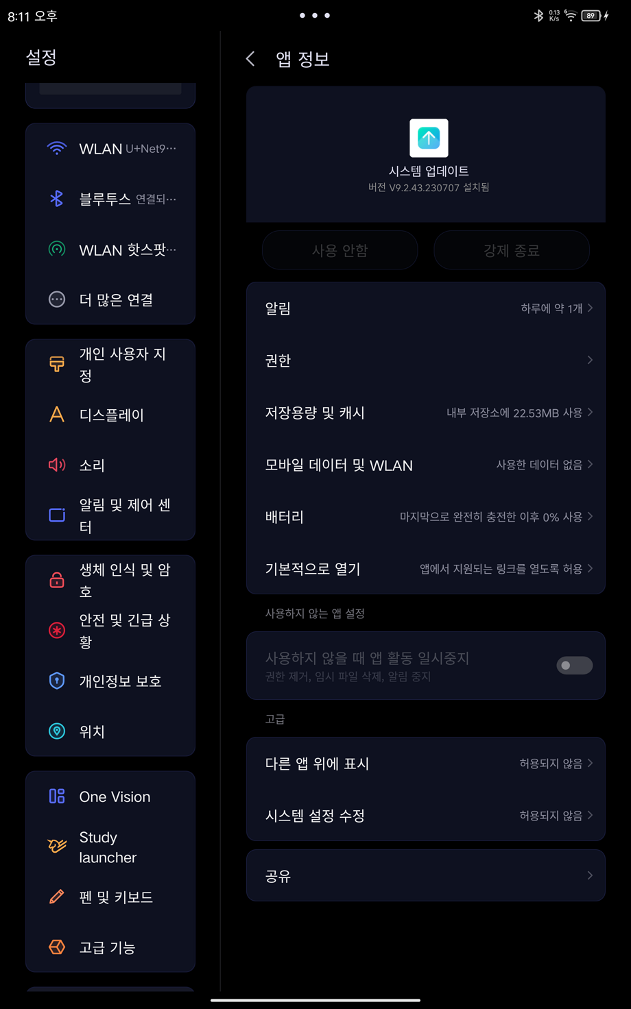 adb shell을 통해 시스템 업데이트 앱을 삭제하는 원천적인 방법을 사용할 수도 있습니다.