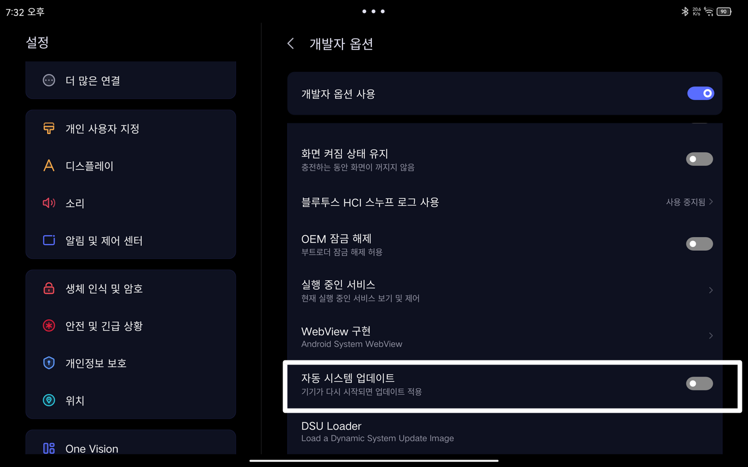 개발자 옵션의 [자동 시스템 업데이트] 항목 OFF