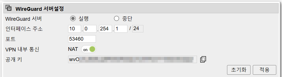 - ipTIME > 고급 설정 > VPN 설정 > WireGuard 서버 설정