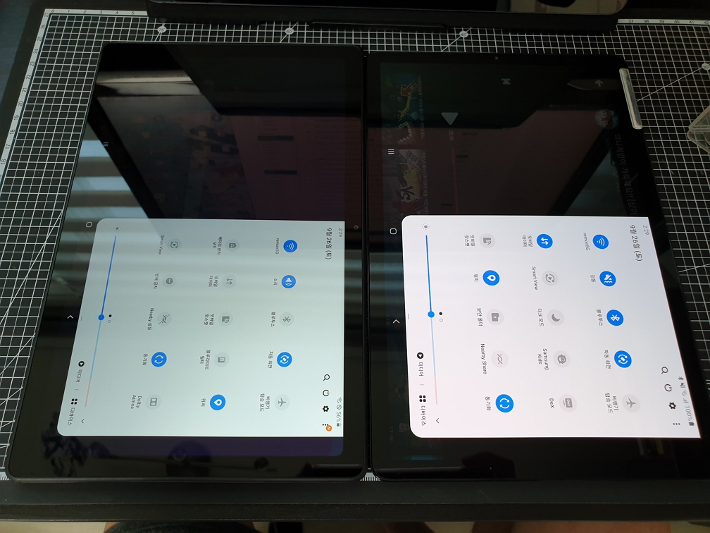 탭S5e와 비교했을 때 같은 밝기면 A7의 밝기가 확연히 어두움