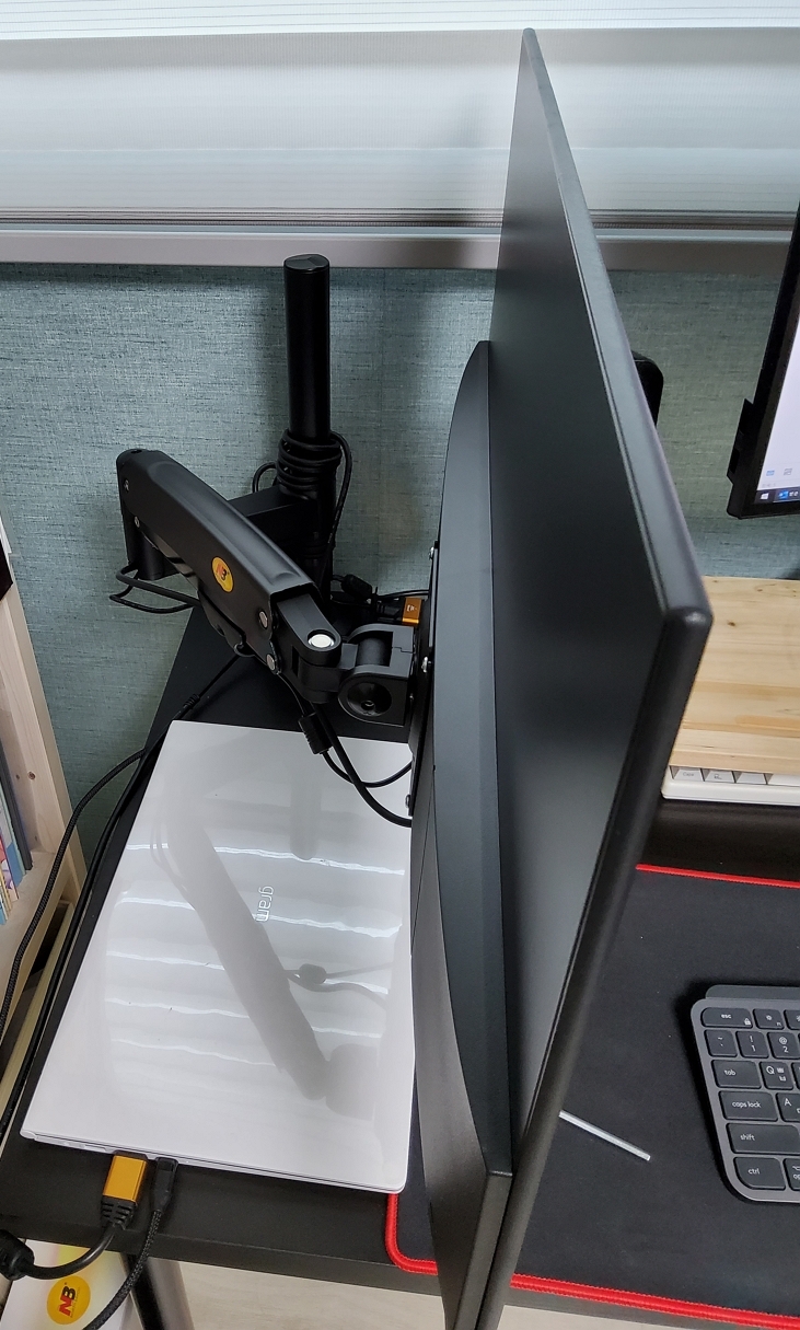 모니터 암 체결하고는 아래로 아무것도 안보이는 완전한 공중부양이 되어야 제 맛인데 저게 망쳤어요!!!