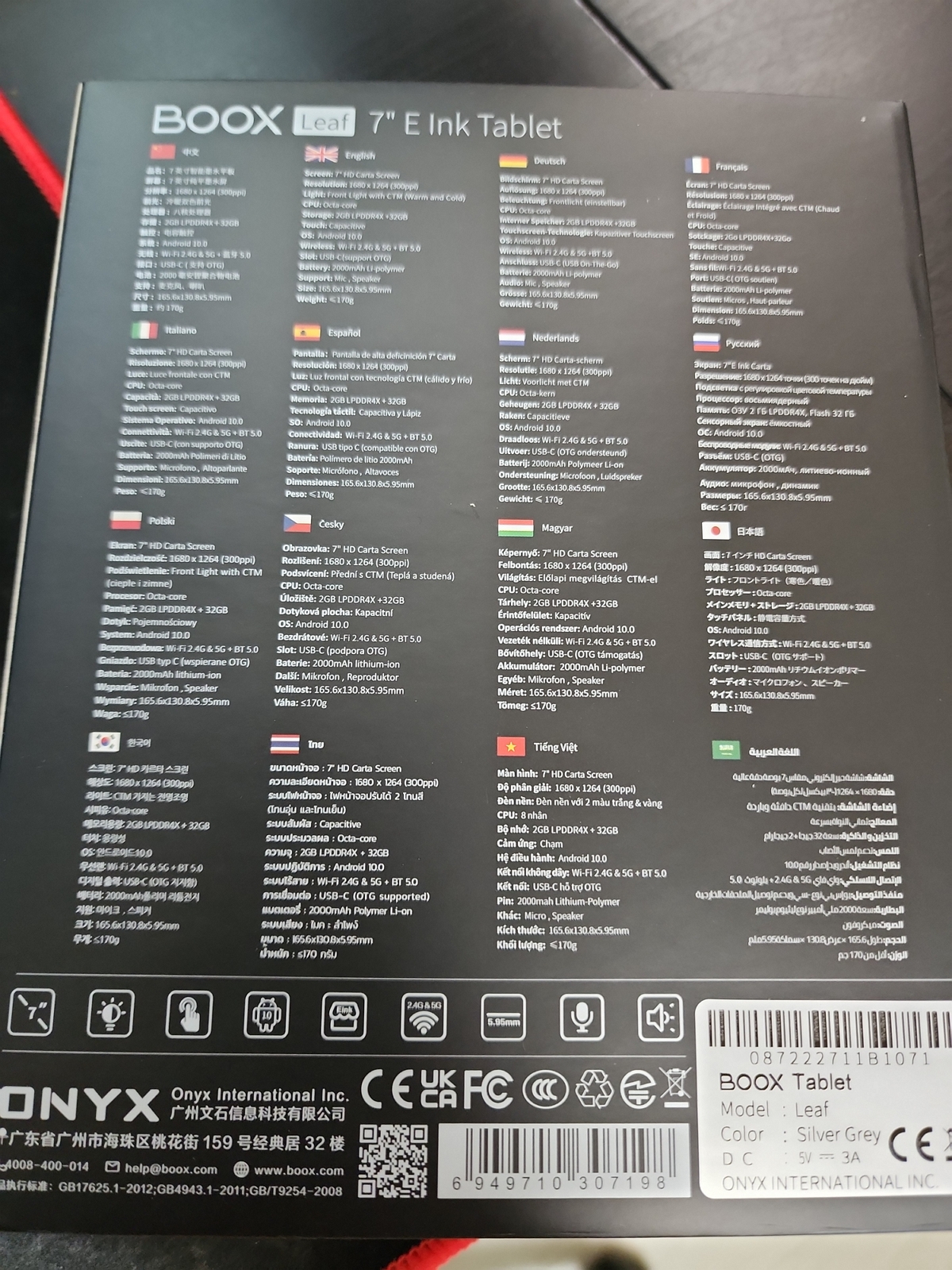 여러나라 언어별로 간단히 제품 스펙이 기술되어 있습니다.