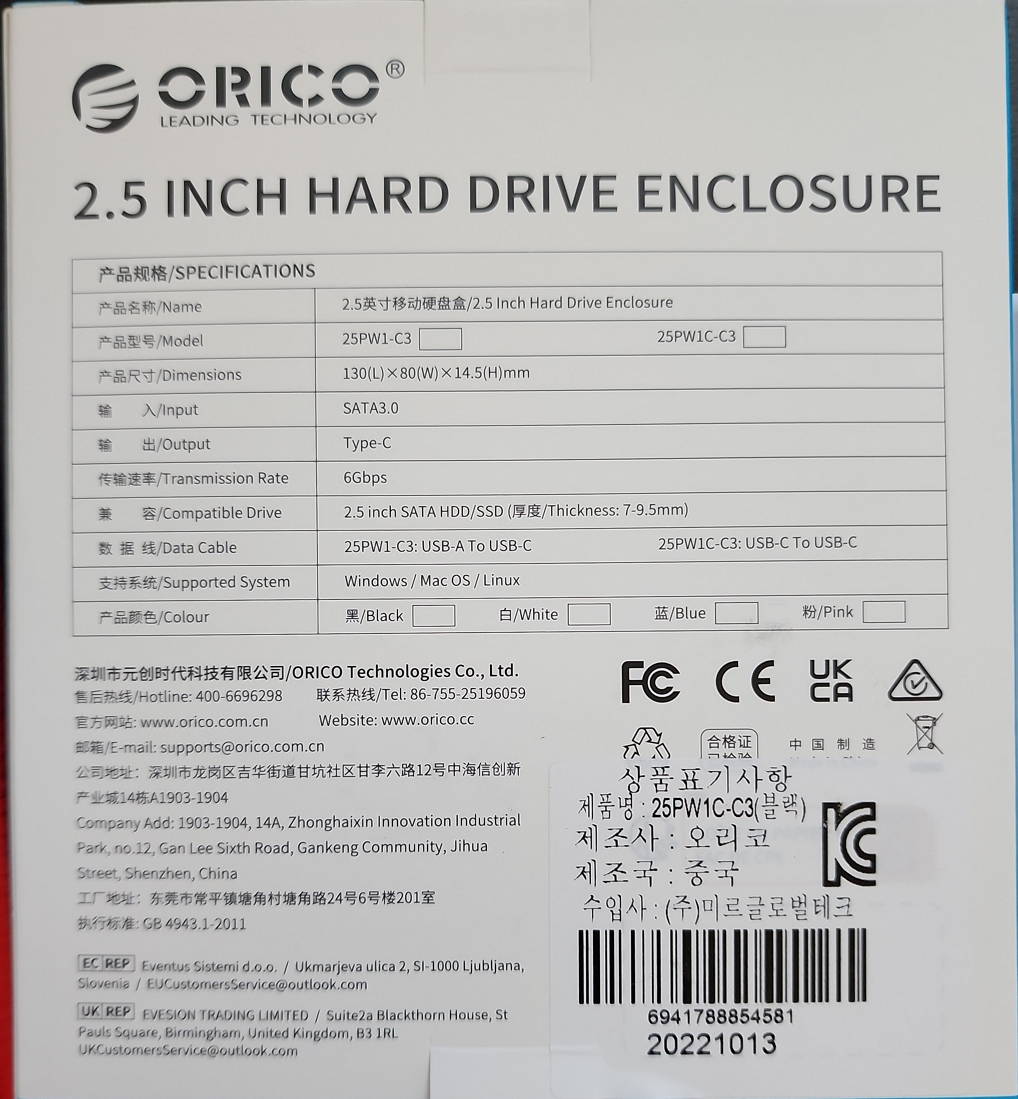 국내 오픈마켓에서 구입한 정식 수입제품인 2.5인치 HDD 인클로저 입니다. (ORICO 25PW1-C3)
