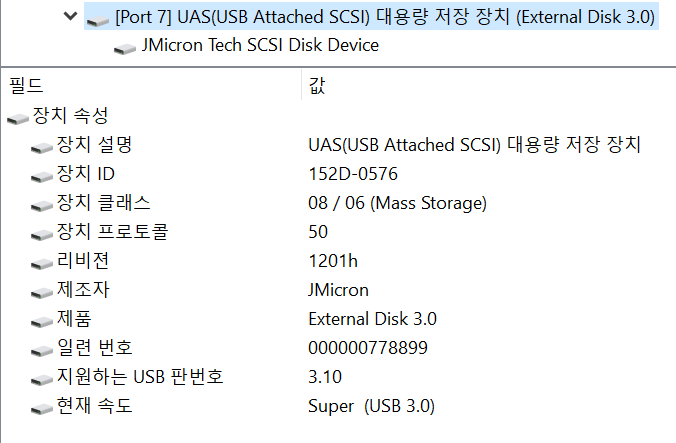 일반적인 USB3 Gen1 이라면 Super Speed로 동작하고 5Gbps의 대역폭을 갖습니다.