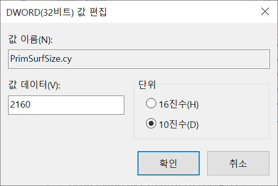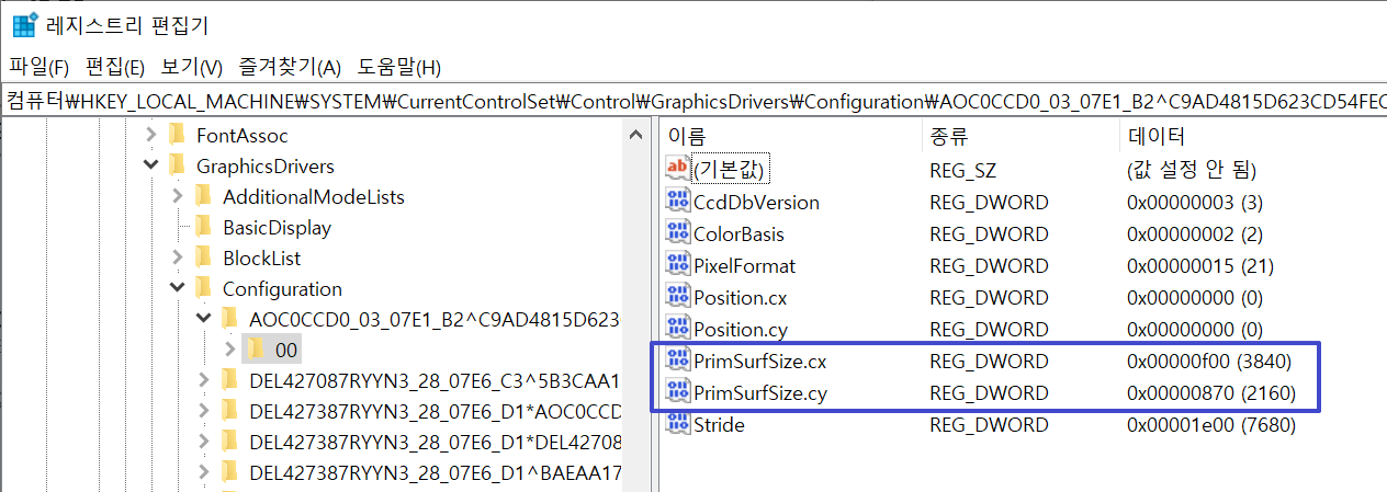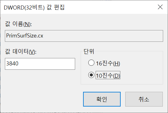 4. PrimSurfSize.cx 항목과 PrimSurfSize.cy 항목을 각각 편집합니다.