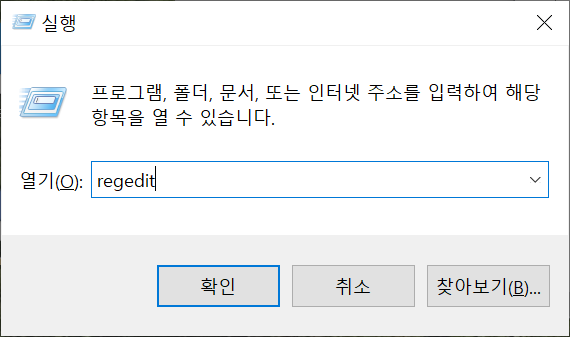 1. Win+R 키로 명령창을 연 후에 regedit 를 입력하여 레지스트리 편집기를 실행합니다.