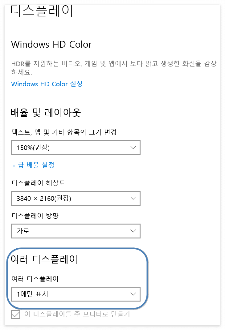 [여러 디스플레이] 설정에서 [1에만 표시]를 선택한 후 저장하면 됩니다.