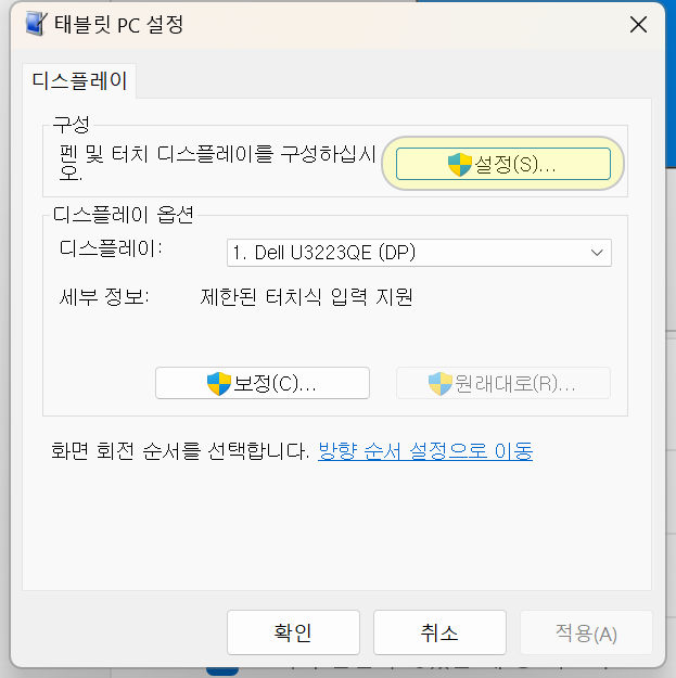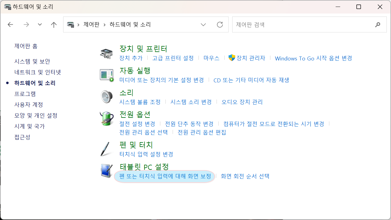 1. 제어판 실행 > 하드웨어 및 소리 > 태블릿 PC 설정 > 펜 또는 터치식 입력에 대해 화면 보정